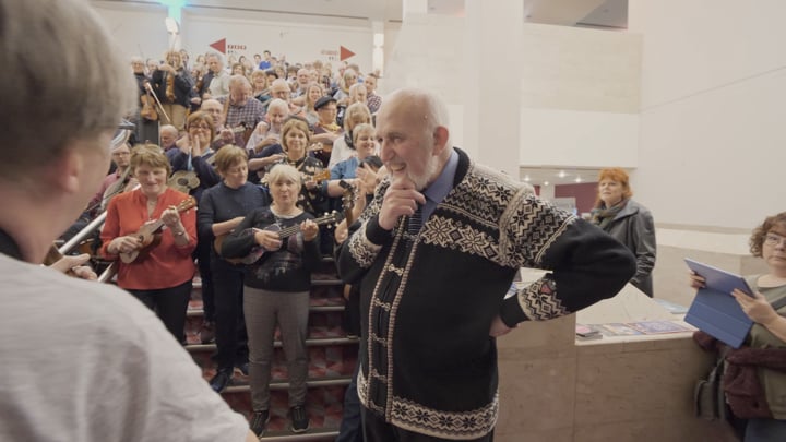 Adam singing Yellow on the Broom on the stairs in the Glasgow Royal Concert Hall
